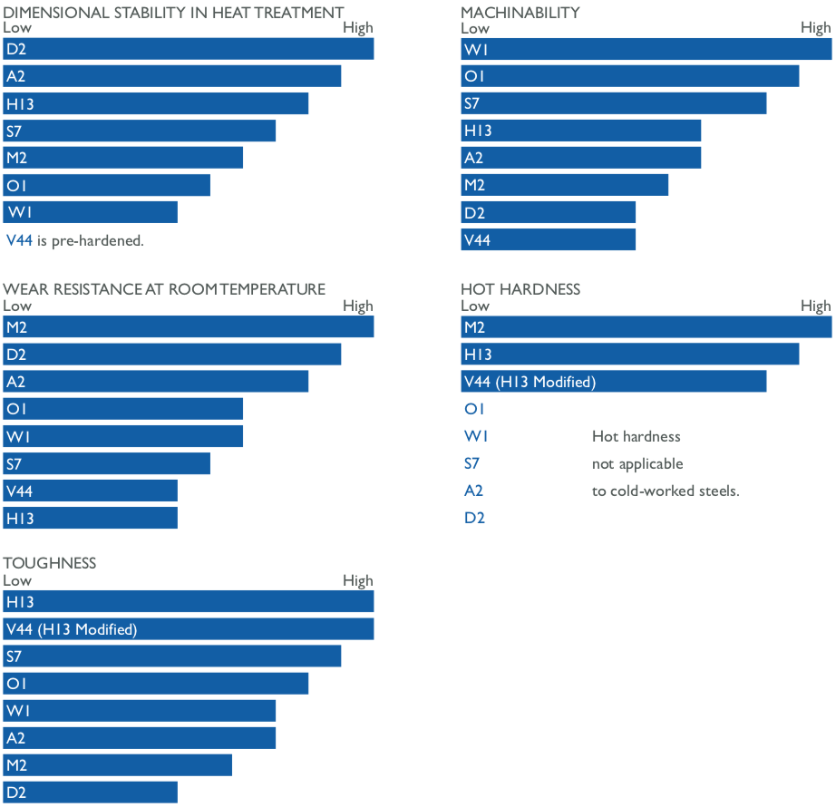 Classification of steel for tooling The tool steel is classified into six types including: water-hardening, cold-work, shock-resisting, high-speed, hot-work, and special purpose. The choice is determined by the needs like price, operating temperature, desired hardness of the surface the strength, resilience to shock and toughness.. The more extreme the conditions of service (higher temperatures, abrasiveness and corrosion, greater load) the higher the alloy content, and consequently the carbide content needed to make the tool steel.
